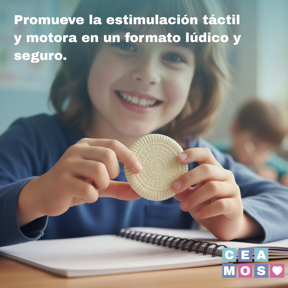 El Mordedor Sensorial Galleta está diseñado para acompañar a niños con Autismo, TDAH u otras necesidades de estimulación oral y sensorial. Su textura suave, forma amigable y tamaño cómodo ofrecen una experiencia calmante que favorece la autorregulación y el enfoque en distintos entornos.
